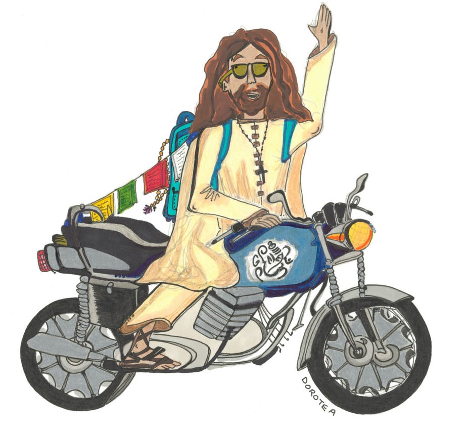 Some years ago I spent two months motorcycling around India.2 I rented the motorbike from a Sikh gentleman, who gave it a blessing under the auspices of Ganesh, the Hindu god of travel and other things. A week later, as I entered the Himalayas, I was given some Buddhist prayer flags to drape around the handlebars.
